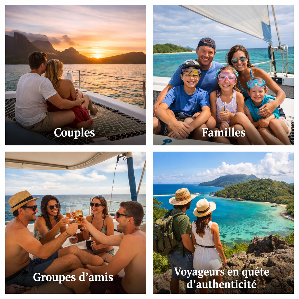 Entre amis, la croisière en catamaran devient une expérience conviviale et mémorable. Partager un apéritif face au lagon, explorer des spots secrets, rire autour d’un repas ou d’une partie de cartes… tout est réuni pour créer des souvenirs uniques.