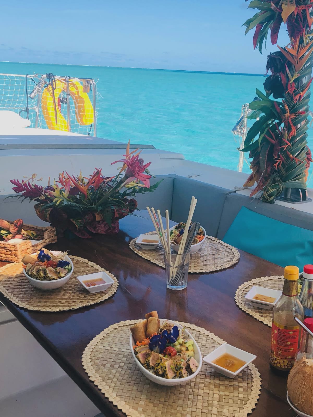 Le catamaran offre suffisamment d’espace pour allier moments collectifs et instants plus calmes. Naviguer ensemble entre Raiatea, Huahine et Bora Bora, c’est vivre la Polynésie autrement, dans une ambiance détendue et authentique.